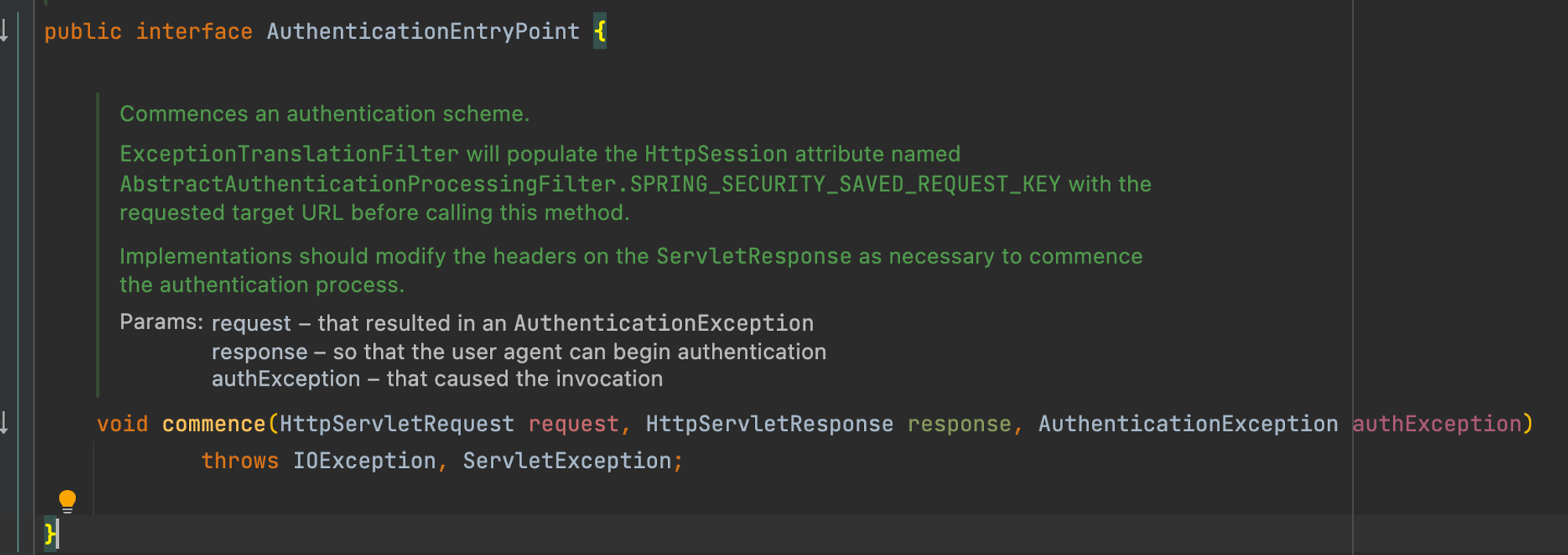 인터페이스 내부를 살펴보면 인증 프로세스를 시작하기 위해 필요에 따라 ServletRespnse의 헤더를 수정해야한다고 나와있다. 따라서 Response의 contentType과 status를 수정해야한다.